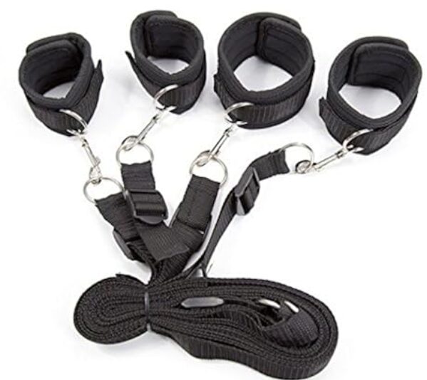 If you don’t have one yet, order one tonight. An underbed system is made of a central strap that lies under your mattress, with four long, adjustable straps reaching out—two for the wrists, two for the ankles. You can pull them out and tuck them away between scenes. It’s perfect for turning your bed into a personal dungeon.