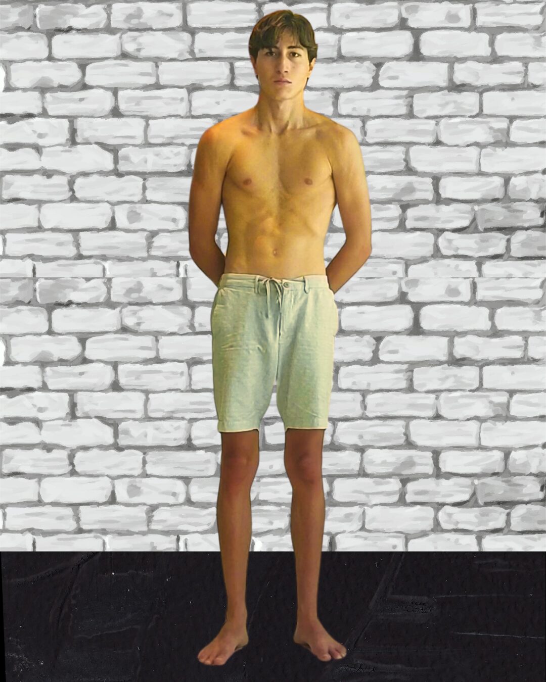 He should be standing upright with a tall, neutral posture. Feet slightly apart, toes pointed forward or just naturally relaxed. His hands are placed behind his back, with one palm folded gently into the other. His shoulders stay back and open, presenting his chest. The chin should be lifted but not defiant. You may choose whether he holds your gaze or lowers his eyes. What matters is that he is alert, accessible, and quietly obedient.
